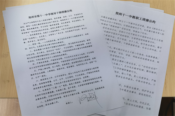 刚刚开学,学校就组织全校师生签订了清廉公约,保证以清廉、诚信、公正、守法为行为准则,做阳光大气、积极向上的郑州11中人。此外,学校还开设清廉宣传专栏、开展“弘扬清风正气 建设清廉学校”书画展、在校园网及公众号进行清廉教育宣传等,通过多种形式,结合党章党规学习和清廉学校建设、作风建设的具体内容,在校园里营造清廉氛围、在师生中传播清廉理念。
